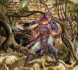 An oni attack on the Wall put the life of Reiha's son Ichiro at risk. Kyofu arrived in time to save his life. Kyofu no longer looked like the Onisu; he was handsome, though his flesh was strangely discolored. He was taken prisoner and requested an audience with Kuon. Kyofu asked to be given command of the Damned so that he could lead a force against the oni. After his intentions were verified by Omen, the Oracle of Jade, Kyofu would command the tainted Crab in what became known as Kyofu's Last March. Kyofu was given Kettei to wield in the battle. Kuni Daigo pledged to bring the sword back to the Crab upon Kuroda's death. [17] Kuroda was killed by Kyoso no Oni in the Battle at the Wall of Bones. [18]