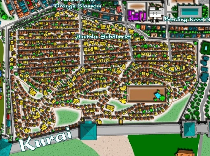 The Juutaku Subdistrict was part of the larger Kurai District at Toshi Ranbo, situated to its south. It was composed of heimin residential space, along with markets at the boundary between the heimin and samurai housings. [1]