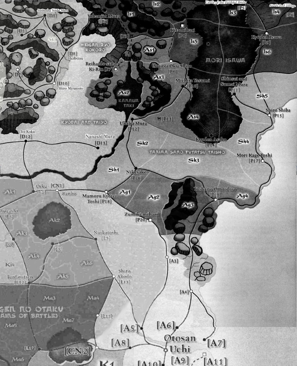 The Asako family lives in the mountains that are the northern border of the Clan, both the Kyodai and Kabe sano Kita and the Yama no Kuyami ranges. These mountains are more like the territories of the Dragon Clan than the rest of the Phoenix lands: they are isolated and beautiful, with a dense air of mystery permeating the landscape. The winters in the mountains, while harsh, are particularly beautiful. More than one Emperor has held a Winter Court at an Asako estate. [17]