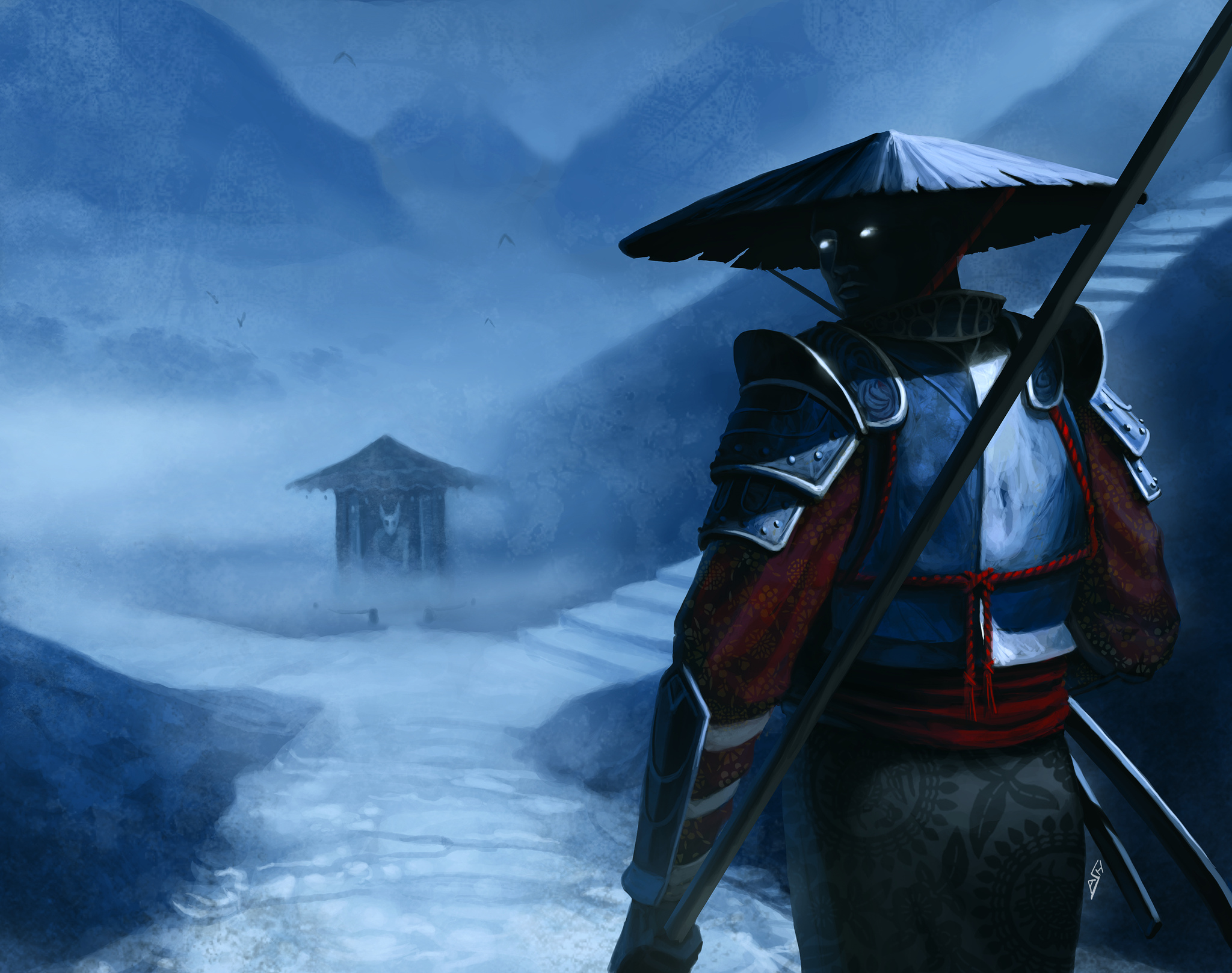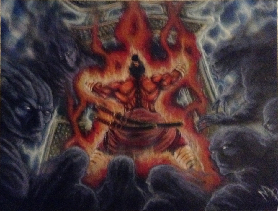 Jama Suru had performed a maho ritual to trap the Kami Shinjo, but Ryoshun answered the spell's call instead. Suru drove his knife deep into the Kami's back... but discovered too late that it was not Shinjo who had been summoned. [12] Ryoshun was killed by Suru. [13] When Ryoshun died, his anguish awoke the Sun from grief. The Sun stepped down from the heavens and her eyes were cold and hard. [14] Ryoshun knew his place was with the dead, to guard them and bear the burden of their souls. It was his duty to seal the gate and ultimately purge Jigoku of the Shadow. [15]