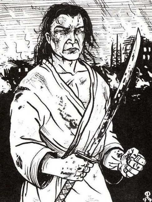 Sanzo, now a ronin, was a small samurai with no daisho, haunted eyes, and bearing a jagged tattoo on one side of his face. He became involved in brawls in every waystation on the road. In one of them, beside the Emperor's Road, Sanzo met the Miya Daimyo, Miya Yoto. The Miya was a fervent supporter of ronin and lower caste samurai, and considered Sanzo the archetype of a ronin. Yoto hired him as his personal yojimbo and took the opportunity to interview Sanzo at length. As payment Sanzo was gifted a daisho. [5]