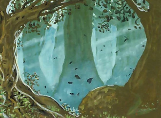 The River of the Sky weaved through the forest. In some places, it vanished below the ground, only to reappear several miles later. To the far north of the forest the waters of the river cascaded over a series of rocks and down into a clear pond. Along a broken cobblestone road near the center of the forest stood a cliffside glade. Four tremendous bridges crossed between the sheer cliffs, giving access to the lush forest of the secluded vale. A small series of creeks and brooks were known as the Estuaries of the Snake because of their coiling and labyrinthine nature. [4]