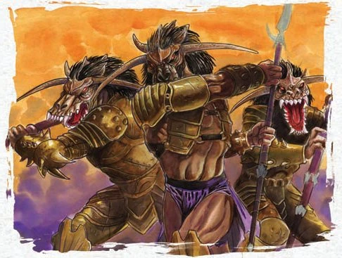 The Tsuno were creatures similar to Ogres. Originally from the Spirit Realms, they were savage creatures who were consumed by bloodlust. Like Ogres, Tsuno worked together in groups and had a strange code of honor. Tsuno used weapons and armor and followed a veteran who was refered to as a ravager. The shugenja of the tsuno were called soultwisters. Their magic called upon the different spiritual realms and was not considered maho. Soultwisters could also learn blood magic if they wished. [1]
