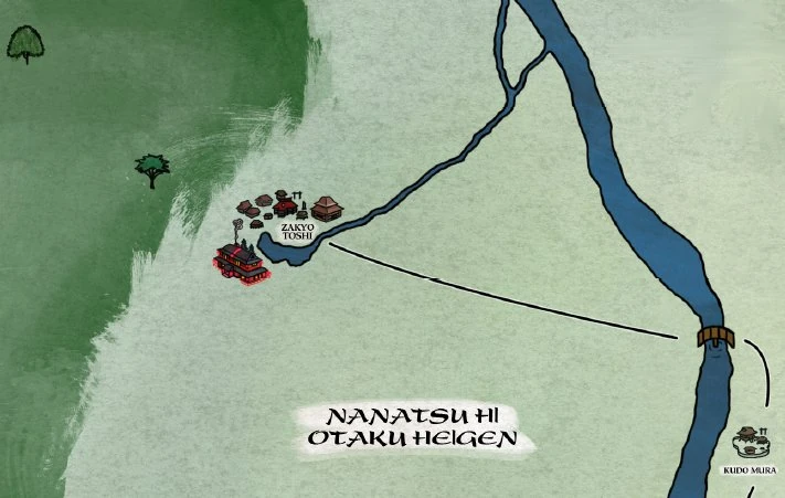 Zakyo Toshi was was built amid the hills, [2] founded in 670 by merchants traveling the southern land trade routes, as a stopover point near the Shinomen Mori. A small tributary of the River of Gold would be used to replenish goods and as a trade route, and renamed Small Trade River. The southern half of the city had no bridges across the river, and the ferrymen transported customers from one side of the river to the other. The city soon became known colloquially as Pleasure City, since any item of luxury or leisure could easily be found within. All kind of bandits were attracted to the area, and they preyed upon the caravans. In 687 its star began to decline as the trade moved to the fluvial lane through the River of Gold, which had a lower risk of banditry. [3]